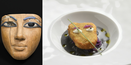 古代エジプト時代の埋葬用マスクをイメージ。エジプトでよく食されているひよこ豆を使ったコロッケには、中東らしいスパイシーな香りを忍ばせて。ひよこ豆の甘み、赤キャベツのエチュベの酸味、黒ごまとヨーグルトのソースのコクが見事にまとまった一品。ひよこ豆のホクホクとした味わいはもちろん、目でも楽しめる印象的な一皿に。