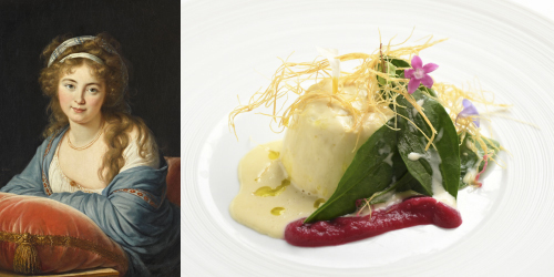 オーベルジュ・ド・リルのスペシャリテ「グルヌイユのムースリーヌ」をアレンジした一皿。モデルとなっている色白の美しいロシア人女性を活帆立貝のムースリーヌで、纏う衣をほうれん草で、艶やかな金髪をカダイフで繊細に表現。ロシアで馴染みの深い野菜"ビーツ"の鮮やかさを活かしたソースにより全体のバランスと華やかさが際立った一皿。