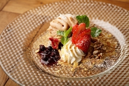 ルーヴル美術館近くのカフェ"アンジェリーナ"にちなんで当店自慢のガトーショコラをモンブラン仕立てにしました。弊社直輸入のセリスホワイトのジュレを飾り、煌びやかに仕上げます。