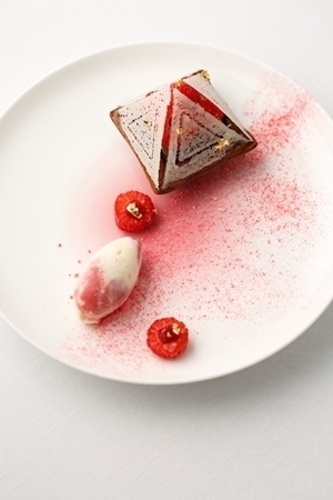 透明な飴をルーヴル美術館のピラミッドに見立て、フランス ヴァローナ社のカライブショコラを使った濃厚なガナッシュとチョレートクリームを層にし、フランボワーズソースを入れました。マーブル状にしたバニラアイスとフリュイルージュのソルベを添えて、華やかに彩りました。