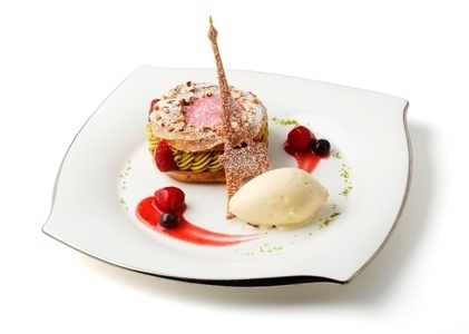 シェフ鎧塚が提案する旬の素材を使ったデザート専門店「Toshi Yoroizuka」。フランス伝統菓子のパリブレストをToshi風にアレンジしました。ピスタチオクリーム・エクアドルショコラを使用したクリームにラズベリージャムをアクセントにし、バニラをたっぷりと使ったアイスクリームを添えています。