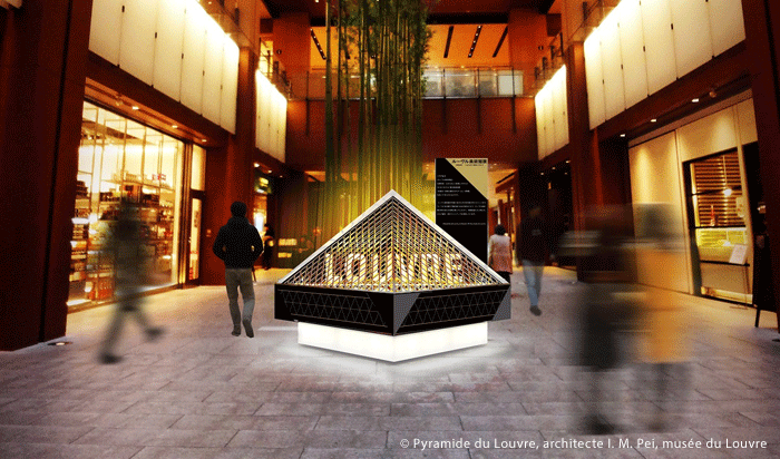本展開催を記念して、パリのルーヴル美術館の中庭にあるガラスのピラミッドをモチーフにしたアートオブジェが期間限定で登場します。ピラミッド内で3色に変化する光の演出により、ピラミッドの朝景から夜景までの情緒を感じていただけます。