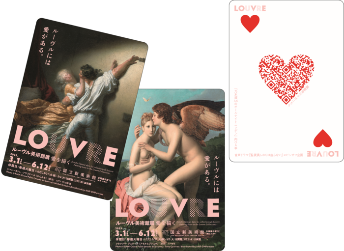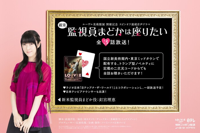 そして、その主⼈公・新米監視員“まどか”役は⼈気声優の釘宮理恵に決定。また、各話には日本テレビのアナウンサーもゲスト出演予定で、第1話には郡司恭子アナウンサーの出演も決定。この企画は、ラジオ日本の番組『日テレアナ・ザ・ワールド!』(毎週土曜22:30〜)番組ともコラボレーションし、全3話を、番組内でも一部放送いたします。さらに、この音声ドラマの完全版は、東京ミッドタウン(六本木)と、国⽴新美術館内で配布する、「ルーヴル美術館展 愛を描く」の作品があしらわれたハートのトランプ型ノベルティに記載されている「⼆次元コード」を読み込むこと等で、聴取可能になります。3話各々異なる、トランプ型ノベルティ(3種)経由での配信となります。東京ミッドタウンでは、ルーヴル美術館展開催記念としての「LOVE×LOUVRE」オブジェも設置され(2月28日~設置予定)、ノベルティGETとともに、フォトスポットとしても、ぜひお楽しみください。
