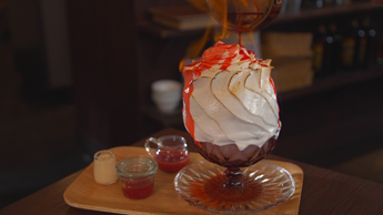 メレンゲで包んだかき氷に火のついたラム酒をかけて味わう、「焼き氷」。