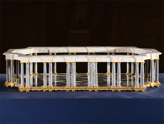 結婚式の祝宴の夜に行われたヴェルサイユ宮の新しいオペラ劇場の落成式では、機械技師が考案した巧妙な仕掛けの中心に巨大な王家用のテーブルが設えられ、セーヴル製作所が特別に製作したこのテーブル飾りが用いられた。彫刻家バシュリエは、大理石なみに白い素焼きの磁器で全体を作った。56本のドーリア式列柱に支えられたポルチコ〔列柱廊〕の中心には、彫刻家ピガールによる彫像の縮小レプリカであるルイ15世像が覗いていた。48のパーツを噛み合わせて作り上げるエンタブレチュア〔列柱の上部〕が、歪みのない完璧な直線を見せている点が見事であった。後にパリの商人に売却された際に分解され、19世紀末にいくつかのパーツを用いて小さなテーブル飾りに作り直されたが、列柱は大理石と金鍍金(きんめっき)を施したブロンズに替えられた。