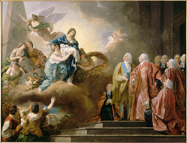 「賢明」と「健康」の寓意に先導されたフランスを象徴する女性像は腕の中に王太子ルイ・ジョゼフ・グザヴィエ・フランソワ(1781-1789)を抱いている。後方から「正義」と「平和」、「豊穣」の寓意が続いている。国王夫妻の肖像画で装飾されたピラミッドは不死の象徴であり、そこに「勝利」の寓意が王太子の誕生の日付を刻んでいる。