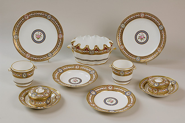 マリー・アントワネットは1777年、ヴェルサイユ宮内で開催されていたセーヴル製作所の販売会で、東洋に想を得たこの食器セットを自ら購入した。王妃はこれを母のマリア・テレジアに贈っている。スープ鉢2点とボトル・クーラー2点、皿36枚などから成るこのセットは、極彩色を特徴とする日本の伊万里焼を下敷きにした独特の装飾ゆえに「食器セット〈日本〉」と記録されている。セーヴルの絵付け職人たちは、ヨーロッパの陶磁器に特有の曲線状のフォルムの上に青地を施し、そこにまとまった絵柄を描き、釉薬(うわぐすり)の上から鉄赤色で線描を補って金箔をあしらうという、日本の磁器の技法を援用した。カルトゥーシュ〔巻き紙装飾の縁飾り〕の中に数本の桜の幹や菊を集めて丘のように描いているのは、日本の構図に着想した図柄である。