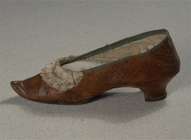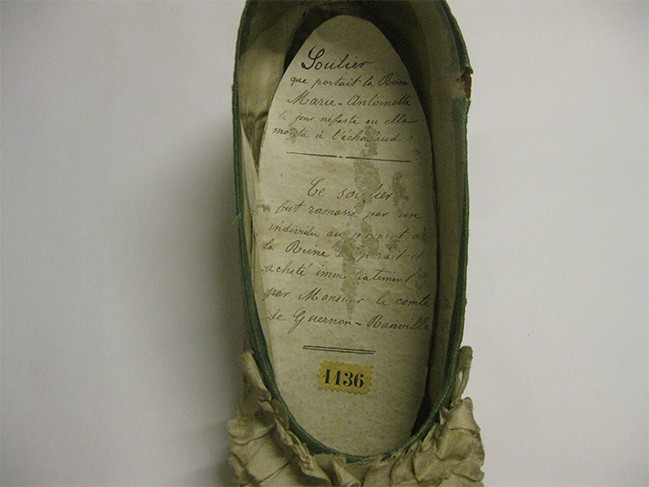 王妃マリー・アントワネットが死刑台にのぼった忌まわしい日に履いていた短靴。この靴は、王妃が脱ぎ落としてしまったまさにその時、ある人物に拾われ、すぐさまある貴族の手に渡った――短靴に添えられているこの記載が、この靴のすべての価値を語っている。