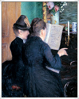 印象派の画家カイユボットは、19世紀末の都市やブルジョワの日常生活、レジャーの光景を数多くの作品に残した。ピアノ演奏の主題は、弟がグランドピアノに向かっている作品の他、本作品が知られる。ここでは羽飾りのある帽子をかぶった婦人がピアノのレッスンに来ている。ピアノを演奏する優雅な女性たちを描いたルノワールやマネらの作品、そして自身の他の一作とは異なって、本作では主人公たちは斜め後ろから捉えられた。このため、手でリズムをとっている教師の背中に隠れて、鍵盤上を動く生徒の手の様子はわからない。多少、窮屈な感がなくもない構図、女性たちの衣服やピアノの色彩の重々しさがレッスンの厳格さを想像させるが、ピアノの上の花瓶と花がそれを和らげている。カイユボットからモネに贈られ、ジヴェルニーの寝室に掲げられていたという事実は、後者にとって特別な女性がモデルであったという推測をもたらしている。