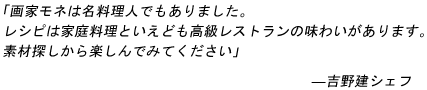 全レシピに吉野シェフのアドヴァイスも付いているので、ご家庭でも充分に調理可能です。料理書としても、アートブックとしても質の高い一冊。