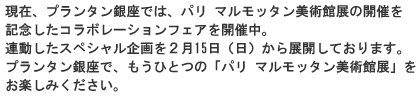 一日の通行者数が30万人を超える銀座の中心地に位置する「プランタン銀座」にて、もうひとつの「パリ マルモッタン美術館展」をお楽しみください。 |