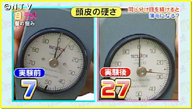 髪の毛を同じところでしっかりと分け、10日間続けると分け目にどんな変化が起こるかという実験です。スタッフには、髪を洗う時以外は、いつも同じ分け目で固定してもらいます。10日後、分け目を見てみると見た目には変化はありませんでしたが、専門家が頭皮の硬さを測ってみると実験前と比べて、4倍硬くなっていました。