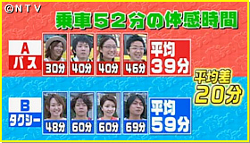 男女8人に「A」「B」のバスチームとタクシーチームに分かれて乗ってもらい、体感時間を比較します。走ってもらうのはこちらのコース。同じ距離を同じ時間走ってもらいます。事前に車内の時計は全部隠し携帯電話などの時間の分かるものも没収します。実験スタート!果たしてバスとタクシーでは体感時間に違いは出るのか?参加者の皆さんには、会話をせず、ひたすら窓の外を見てもらいます。ゴールに到着。ここまでかかった時間は52分。このドライブを一体どのくらいに感じたのか?