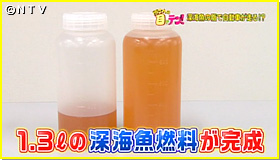 早速、筑波大学に戻り、魚を煮込んで脂を取る方法で抽出します!鍋の中にアラを入れて煮込むこと30分。すると、表面に脂が浮いてきました!この作業をひたすら繰り返すこと5時間、1・6リットルの油の抽出に成功!この油にメタノールと苛性ソーダを混ぜた液体300mlを油に加え撹拌。こうして、およそ1・3リットルの深海魚から作ったバイオ燃料が完成!果たして車は走るのでしょうか?