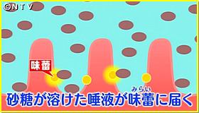 甘さは、舌にある味蕾で感じます。しかし、舌には凹凸があり、甘さを感じる味蕾は奥深くにあるため、固形のものでは甘さを感じにくいんです。こしあんの場合、あまり噛まなくても、喉を通るため、比較的甘さを感じにくくなるんだそうです。一方、粒あんは小豆の皮などがあり、飲み込む前に、こしあんよりたくさん噛み、唾液が多く分泌されるので、砂糖が溶けた唾液が味蕾のある奥の方まで届きます。だから同じ糖度でも、甘く感じやすいんです。