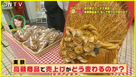 そこで目がテン大実験!パン屋さんに協力してもらい、1個300円の商品を用意。さらにもう1つ、秋にふさわしく、麦の穂をイメージした、1個10万円の巨大飾りパンも用意!高額商品が横にある時とない時とでは、パンの売り上げにどんな影響があるのか実験です。