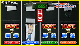 温度が次第に上昇。すると100℃を少し超えたところで…ポリエチレン製のラップが破れて落ちました。さらに温度は上がり、120度を超えたところで、今度はポリ塩化ビニルで作られたラップが脱落。最もニオイが漏れなかったポリ塩化ビニリデンのラップは160度の手前で落下!残ったのはポリメチルペンテンを材料にしたラップは180℃を超えたところで伸びきって実験器具の底についてしまいました。結果、ラップはどれも100度から180度ほどで使えなくなってしまうことがわかりました。これでは安心してラップでチンができません。なので、レンジで温める時のポイントはラップを油分の多い食品に直接つけないこと。深めの器に入れてラップと食品がくっつかないようにすれば、溶けたり破れたりすることを防げるんです。