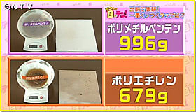 その結果は…4つのどんぶりの重さを量り、最初の1000gに最も近かったラップがくっつき力の高いラップということ。まず、ポリ塩化ビニリデンのラップは重さ757gと大幅減少。業務で使われることが多い、ポリ塩化ビニルはなんと、999gほぼそのまま!残りの2つのラップの結果はご覧のとおり。くっつき力が1番強かったのは業務用に多いポリ塩化ビニルでした。ポリ塩化ビニルのラップは柔らかくて良く伸び縮みする特徴があるんです。