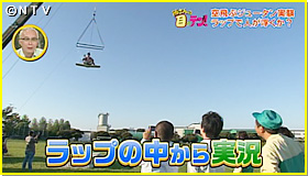 サッカー場に巨大なクレーンを用意。厚さ0・01mm!空飛ぶジュータンでユージを飛ばそうプロジェクト!もちろん万が一に備え、プロテクターと命綱を装着。さらにラップの1点に力がかからないよう、たわまない木の座布団に座ります。ユージの体を支えるのはラップだけ!