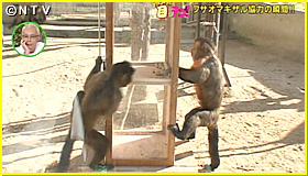 そこでやって来たのは京都市動物園。フサオマキザルの飼育舎に設置された実験装置の底には、フサオマキザルの好物・落花生が入っています。しかし、この落花生を取り出そうとしても、装置の右側に2つ穴があけられているものの、穴から底まではフサオマキザルの手が届かない深さになっています。装置左側についたヒモを引っ張ると底が持ち上がり、落花生に穴から手が届く仕組みになっています。一匹がヒモを引っ張っても穴は逆側に開いているので、そのサルはエサは取れません。一匹が、自分が取るためではなく、他のサルのために、紐を引っ張れば逆側の穴から、他のサルがエサを取れるという装置なんです。
