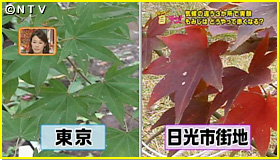 そこで引き続き残りの二つのもみじの観察を2週間続けました。まずは東京のもみじを見てみると、2週間経ったのにまだ緑のまま。ほとんど色が変わっていませんでした。一方、日光のもみじを見てみると、綺麗な赤に紅葉していたんです。