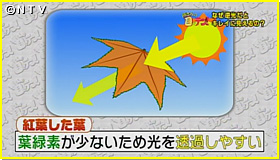 そして2週間後、目がテン特製もみじの「めみじちゃん」がコチラ!シールの下の部分、目の形に黄色くなっています。紅葉は昼間太陽が十分に当たる事で赤い色素を作る酵素が働いて赤くなるが、シールで日光をさえぎった部分は、酵素が働かないため、カロテノイドという葉に元々ある色素が残り、黄色くなってしまったというわけなんです。