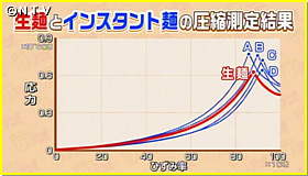 では、「生」と「インスタント」、ホントにモチモチ感は近いのか?「生麺」と「生麺風インスタントラーメン」を、それぞれ歯で麺を噛み切る時と同じ要領で麺に圧力をかけ、切れるまでの力、噛み応えを計測。生麺と、4種類のインスタント麺のデータを比べてみると、噛み応えはほとんど同じ!つまり、「生麺風インスタントラーメン」のモチモチ感は、生麺とそっくりだということが分かったんです。