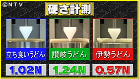 さらに歯ごたえも、普通のうどんに比べて格段に柔らかいんです。そこで、他のうどんとどれほど違うのか比較。比べるのは一般的な立ち食いうどんとコシで有名な讃岐うどん。まずは硬さを比較すると、伊勢うどんは他のうどんよりも圧倒的に柔らかかったんです。さらに太さも伊勢うどんは段違い!