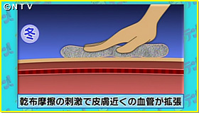 冬は寒いので、血管が収縮しています。そこに乾布摩擦をする事で、皮膚近くの血管が拡張します。血管の表面積が増えるので、お風呂に入った時、体が温まりやすくなるんです。高くなった体温を元の状態に戻そうと、心臓が、送りだす血流量を増やし血管から放熱、この時、エネルギーを消費します。乾布摩擦後の入浴は、普通に入浴するよりも体温が上昇するので、放熱に時間がかかり、その分、消費エネルギー量が増えたんです。