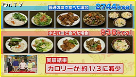 この日も安村アナは、1品目から食欲全開!バクバクと嬉しそうに食べていきます!そして前回同様、2時間経過したところで実験終了!前回との比較をすると・・・なんと!普通の皿で食べた料理は約2800kcalでしたが、小さな取り皿で食べた料理は900kcal!普通の皿の時の1/3以下の食事量にまで減ったんです。では、一体なぜお皿を変えただけで食べる量が減ったのか?専門家に聞くと「大きなお皿に乗せる場合と小さなお皿に同じ量を乗せる場合とでは、小さなお皿に占める割合が多いですから、ついつい多めに判断する。お腹が満腹になる前に、視覚的に十分満足だということが脳にわかれば、私たちはそれ以上食べない」。