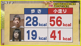 2人の男女に、郵便物を取りに行ったり、トイレに行ったりと日常的な行動を10個小走りで行ってもらいました。普通に歩いた時と消費エネルギーを比較してみると・・・なんと!小走りで行った場合は、歩いたときと比べて倍増していたんです!軽い運動でも、継続的に行う事で消費エネルギーが増えることがわかりました。