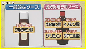 食品研究の専門家に伺うと「"お好み焼き用ソース"がお好み焼の大きな要素です」。お好み焼き用のソースの原材料を見てみると、昆布やしいたけ、さらにはオイスターエキスなど、実にたくさんのうま味がブレンドされている事が解ります。ソースの中には複雑な多様なうま味がいくつも入っており、Aの食材でも、Bの食材でもうまくその味を引き立ててくれるというんです。さらに、お好み焼き用のソースにはもう一つ特徴が!