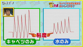 そこで、食品の食感を測る装置で、キャベツのみと水だけの生地の粘度をそれぞれ計測。結果は、キャベツのみで作った生地は、水だけよりも粘度、つまりモチモチ感が高い事が解りました。