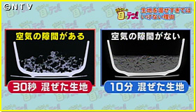 そこで、混ぜ時間の違う、焼く前の2つの生地を最新のCTスキャナーで見てみると、30秒だけ混ぜた生地には具材の間にたくさん空気が入っている事が解りました。続いて10分混ぜた生地を見てみると、空気がほとんど入っていません。そう!この"空気の入り方"が焼き上がりに大きな影響を与えるんです。さらに断面を見てみると・・・。混ぜ時間30秒は、焼きあがった生地に適度な隙間がありますが、混ぜ時間10分の方は、中がみっちり詰まっています。実は生地と具材を混ぜ過ぎると、出来上がりが堅くなってしまうんです。