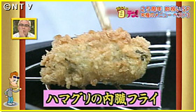 カキの身は、そのほとんどが内臓。唯一違うのは貝柱だけ。たとえば14グラムのカキの場合およそ13グラム、じつに93%が内臓!つまりカキの味は内臓そのもの。ということは、他の貝の内臓だけを食べれば、カキの味になるかも!?そこでハマグリの内臓を集め、偽カキフライを作ってみました。見た目はカキフライそっくり!これを所さんに内緒で食べてもらうと大喜び!