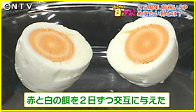 後藤アナが専門家を尋ねると、「鶏の卵を使って、紅白卵を作ることができる」とのこと。紅白の卵とは、一体どんなものでしょうか?実は卵の黄身の色は、餌の色で決まるんです。これを利用しておめでたい卵作りに挑戦。白い黄身は、大麦で、赤い黄身は、トウモロコシに粉末にしたパプリカを混ぜて作ります。学生さんにも協力してもらい赤と白の餌を与え続けること2週間。赤い餌と白い餌を2日ずつ交互に与えて産まれた卵をゆで卵にして割ってみると…木の年輪のようになっている!