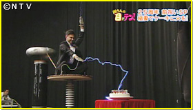 このテスラコイルを使って、ユージがスタジオで実験に挑戦!ケーキに立てられた25本のローソクに、このテスラコイルを利用して火をつける!実験の結果、あとチョットで火がつきそうでしたが、今回は失敗!!スタッフは成功したので、いつかまたユージがリベンジしまーす!