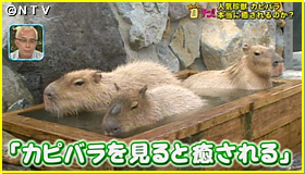 日本全国で、大人から子供まで大人気。癒し系として愛されている珍獣、カピバラ。人気の秘密はどこにあるのか? やって来たのは、カピバラとふれあうことができる「那須どうぶつ王国」。中で、人だかりを発見!そこにいたのは、気持ちよさそうに温泉に入るカピバラです。目を閉じてお湯に浸かる姿は、本当に気持ちよさそう。お客さんの多くは口々に「カピバラを見ると癒される」というんです。キャラクターデザインの研究をしている多摩美術大学の秋山教授によると「かわいいと癒やしの効果のある動物やキャラクターには2つの特徴があります。1つは、頭が大きくて全体的に丸みをおびている。2つめは、目と口が近い。」これが特徴とのこと。