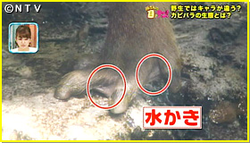 実は、カピバラはネズミの仲間ですが、水辺で暮らす動物。なので、よく見ると、足の指の間に水かきがついているんです。これで上手に泳ぐことができるのです。また、野生のカピバラは、5分間も潜水できるといわれています。さらに、カピバラの特徴的な顔も水中に適した形になっていたんです。カピバラの顔を真横から見てみると、確かに耳、目、鼻が一直線に並んでいます。この特徴を生かし、体は水の中でも、耳、目、鼻だけを水面から出し、天敵を警戒しながら泳ぐことができるのです。目と口が離れていて、癒しの特徴にはあてはまらないウマヅラな顔は、実は水中に適した構造になっていたのです。