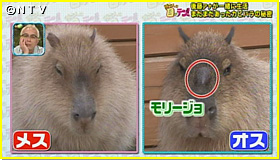 ちなみに、こちらの2頭はメス。その見分け方は…オスだけにある、鼻の上の突起物『モリージョ』。これがメスにはありません。オスは交尾期になるとモリージョから分泌物を出して、メスをひきつけるんだそうです。2頭は、人間でいえば小学校に上がったばかりの女の子。仲良くなるためにスタッフが用意した遊び道具を使ってみます。子猫が大好きな「猫じゃらし。」しかし、鼻をピクピクするだけです。さらに、こちらも子猫が好きな毛糸玉。やはりノーリアクション。どうすれば仲良くなれるんでしょうか?飼育員の方に聞くと、撫でると仲良くなれるという、"喜びのツボ"を教えてくれました。慣れている人が「喜びのツボ」を撫でるとお腹を見せてゴロンと横に!後藤アナもこの姿を目指します!早速、喜びのツボだというお尻や首筋を撫でてみますが…一切喜ばず!残念!続いては、エサやり。カピバラが好きそうな食材を用意。