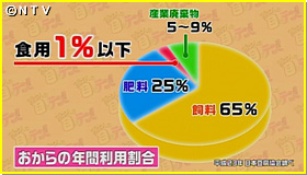 これを細かく砕いて煮つめ、絞ったものが豆乳。これにニガリを加えて型にはめると豆腐になります。この豆腐の製造過程で、豆乳を作る時に出る搾りかす、これが"おから"なんです。取材した工場では1日2万丁、6トンもの豆腐を製造。同時にその5分の1、およそ1.2トンのおからが出るんです。通常"おから"は、家畜の飼料や有機肥料に使われ、食べられているのはわずか1%以下。