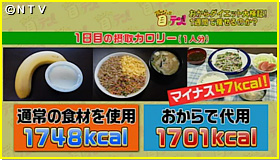こうして1日目は通常の食材を使った場合よりも47キロカロリー減らすことができました。夕食を食べ始めた家族、すると子どもたちが満腹感を訴え、ご飯を残したのです。専門家によると、おからが水分を吸収、胃の中で膨らみ、それが脳に伝わって、満腹感をもたらしていたんです。さらに、おからに多く含まれる食物繊維は水に溶けない不溶性。だから胃で分解されずにゆっくり腸に届くのです。また、一緒に食べた栄養素の吸収をゆっくりする傾向があり、急激な血糖値の上昇も防げ、比較的食べた物が脂肪に変換しにくいという事が考えられるそうなんです。