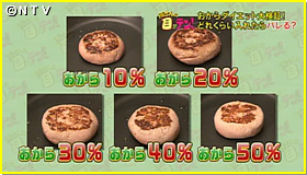 ならば、ハンバーグに、どれくらい"おから"を混ぜたら分かるのか実験です。用意したのは、合いびき肉とおからの割合が10%から50%まで、5段階のハンバーグ。