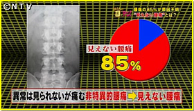 1つは、椎間板(ついかんばん)が飛び出して神経を圧迫する椎間板ヘルニアなど、レントゲンやMRI診断で明らかな異常が見られる"特異的腰痛"、つまり「見える腰痛」。そしてもう1つは、骨などに異常は見られないのに、腰が痛むという"非特異的腰痛"つまり、「見えない腰痛」。この「見えない腰痛」は、腰痛全体の85%を占め、病院での機械による診察では、腰のどの部分が痛いのか、特定が難しいため、お医者さんでも原因がよくわからないんです。