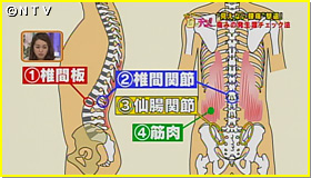 金岡先生によると、見えない腰痛の発生源は全部で4つ。背骨と背骨の間にある軟骨「椎間板」。背骨同士を後ろでつないでいる「椎間関節」。骨盤と腰椎(ようつい)をつなぐ「仙腸関節」。そして、腰回りの「筋肉」。この4つの部位に炎症など、なんらかの見えない異常があることで腰痛が引き起こされているというんです。では、一体どのように腰痛をチェックするのか?さっそく、チェック開始!