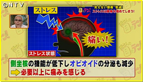 専門家に聞くと、「痛みを感じる時には、脳の中の側坐核がオピオイドを分泌してその痛みを和らげる働きをしてくれているんです。ただ慢性的にストレスが加わっていると側坐核からのオピオイドの放出が少なくなってしまって、それによって痛みをより感じやすくなってしまう」。人は、痛みの原因となる刺激が起こったとき、そのシグナルが脳の「側坐核」へと伝わることで痛みを感じています。健康な状態の場合、痛みのシグナルが「側坐核」へ伝わると、神経物質「オピオイド」が分泌され、生命活動に支障がでないよう、痛みを適度に制御します。しかし、ストレスを感じている場合、「側坐核」自体の機能が低下してしまうため、オピオイドの分泌が少なくなり、痛みが適度に抑えらず、必要以上に痛みを感じてしまうんです。