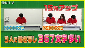 他の人が周りにいる方が作業がはかどる!?そこで実験!男女6人を3人ずつに分けて平仮名の書き写しを行ってもらいます。それぞれチームごとに1人で作業する場合と3人一緒に作業する場合の2つの環境で行います。青チームは、まず1人で書き写しを行い、その後、今度は3人一緒に行ってもらいます。一方、赤チームは青チームとは逆の手順でまず3人一緒に書き写しを行い、その後、1人で行います。それぞれ15分ずつ作業を行ったところ…結果は、1人で書き写しを行った時の合計は2063文字。一方、3人一緒に書き写した時の合計は2430文字。なんとその差は367文字!3人一緒に作業をした時の方が、15%も多く書き写す事が出来たんです。