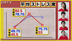 ストレス度は、唾液に含まれる、ストレスを感じた際に放出されるホルモンで測定します。まず、ストレスを受ける前の4人の平均ストレス度は49・75。この値がストレスを受けるとどう変化するのか?