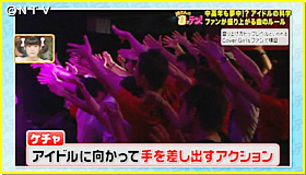 「最近のアイドルソングには、ファンが盛り上げやすいいくつかの要素が入っているんです。わかりやすい例だと、ミックス、PPPH、ケチャと呼ばれるものです」。ミックスは、イントロや間奏での掛け声のこと。曲の内容と関係ない言葉が続きます。そしてPPPHは、パンパパンヒューの略で手拍子のこと。ケチャは、アイドルに向かって両手を差しだすこのアクション。インドネシアの踊りにヒントがあると言います。確かに多くのグループでこれら"共通の盛り上げ方"が見られました。つまり、3つの要素が入っているからアイドルソングはみんなで盛り上がることができるんです。