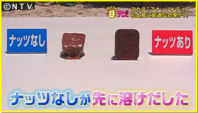 果たして、どちらが早く溶けるのでしょうか?テーブルの上の温度は40度近くになっています。すると・・・チョコレートを置いてから8分後、変化が起こり始めました。マカダミアナッツを入れていない方が先に溶けだしたのです。一方、ナッツ入りチョコが溶けたのは、それから5分後、チョコを置いてから13分経ってからでした。